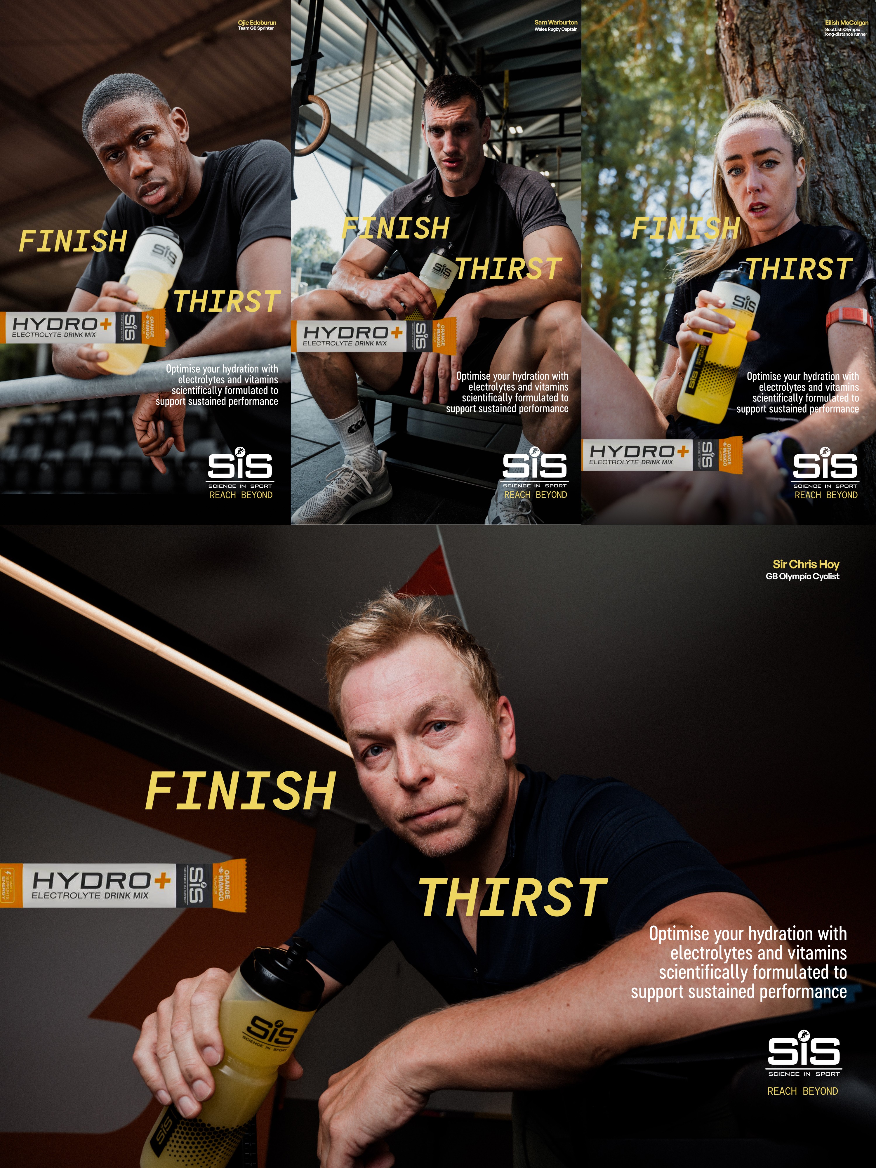 We produced a multi-location campaign for Science in Sport Hydro+ over three days, travelling between London, Barcelona and the Pyrenees to capture some of the UK’s top athletes including Ojie Edoburun, Eilish McColgan, Sam Warburton and Sir Chris Hoy. The creative focused on the reality of elite sport and the levels of sweat and effort behind performance, combining cinematic video work with bold hero stills designed for both editorial and out-of-home advertising. The content was distributed across magazine features, billboards and a national Sky ad campaign.